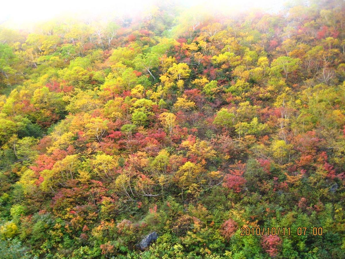 紅葉の登山道をゆっくりと分け入っていく。吐く息は少し白いが寒くもなく気持ちよい朝だった。