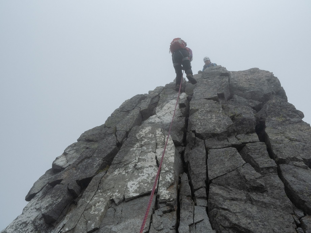もうエキスパートは来ないだろうかと目を凝らして北尾根を見ていると、2峰に登山者がひょっこり現れた。懸垂下降ショーをかぶりつきで見せてもらう。