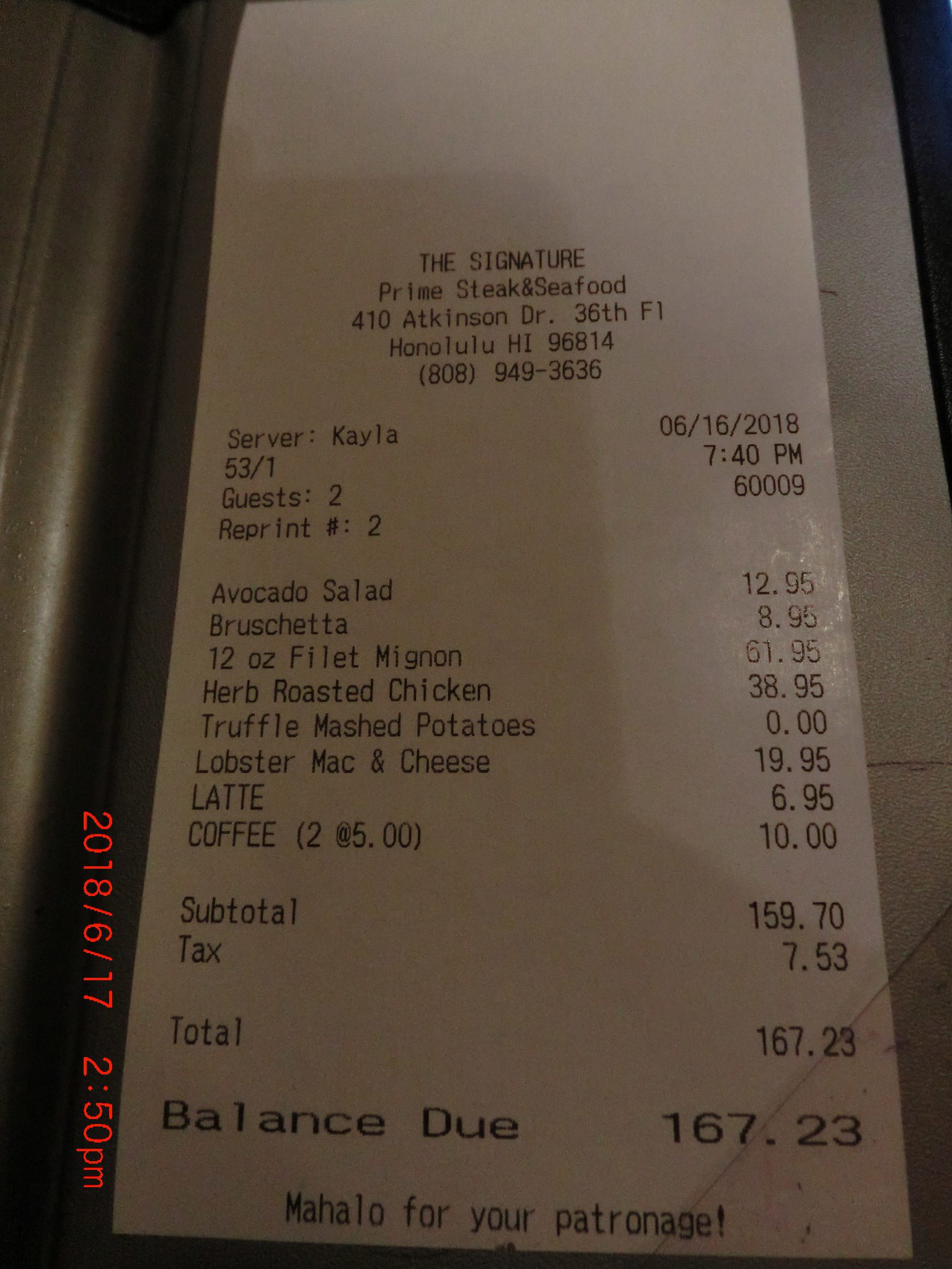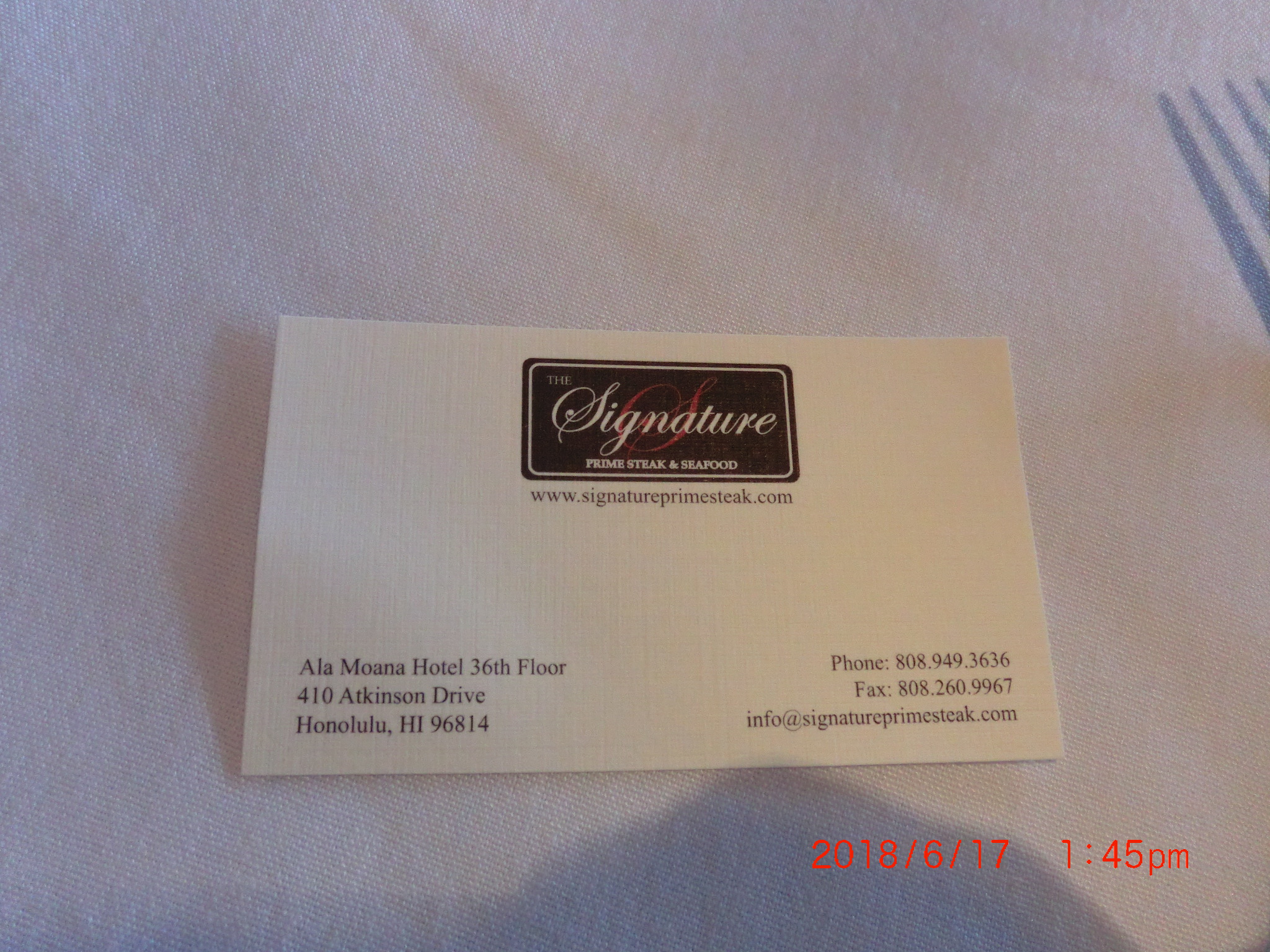 最終日の夜は、アラモアナホテル36階のシグネチャーで、ちょっとご馳走を。予約なしの飛び込みでも、運良く入店できた。
