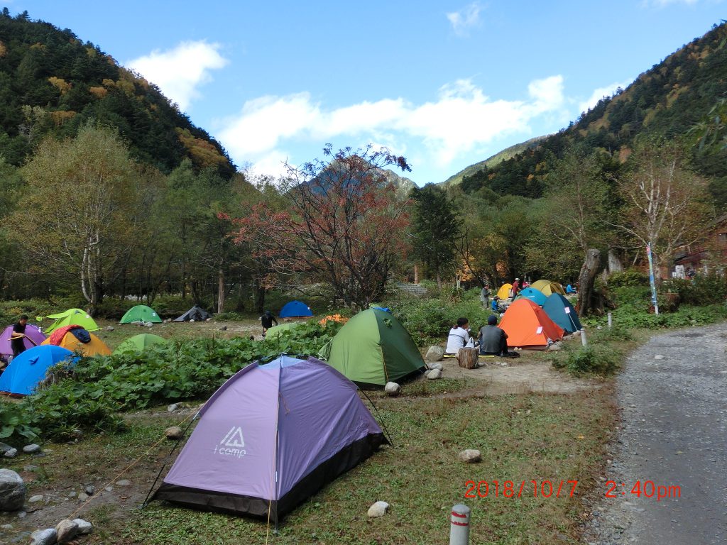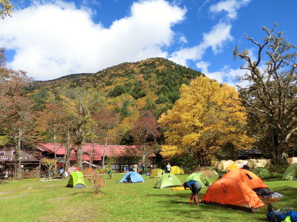 徳沢まで来るとテントがたくさん張ってあって、明神とは雰囲気がガラッと変わる。空も好天青空になり、紅葉もいい感じ。