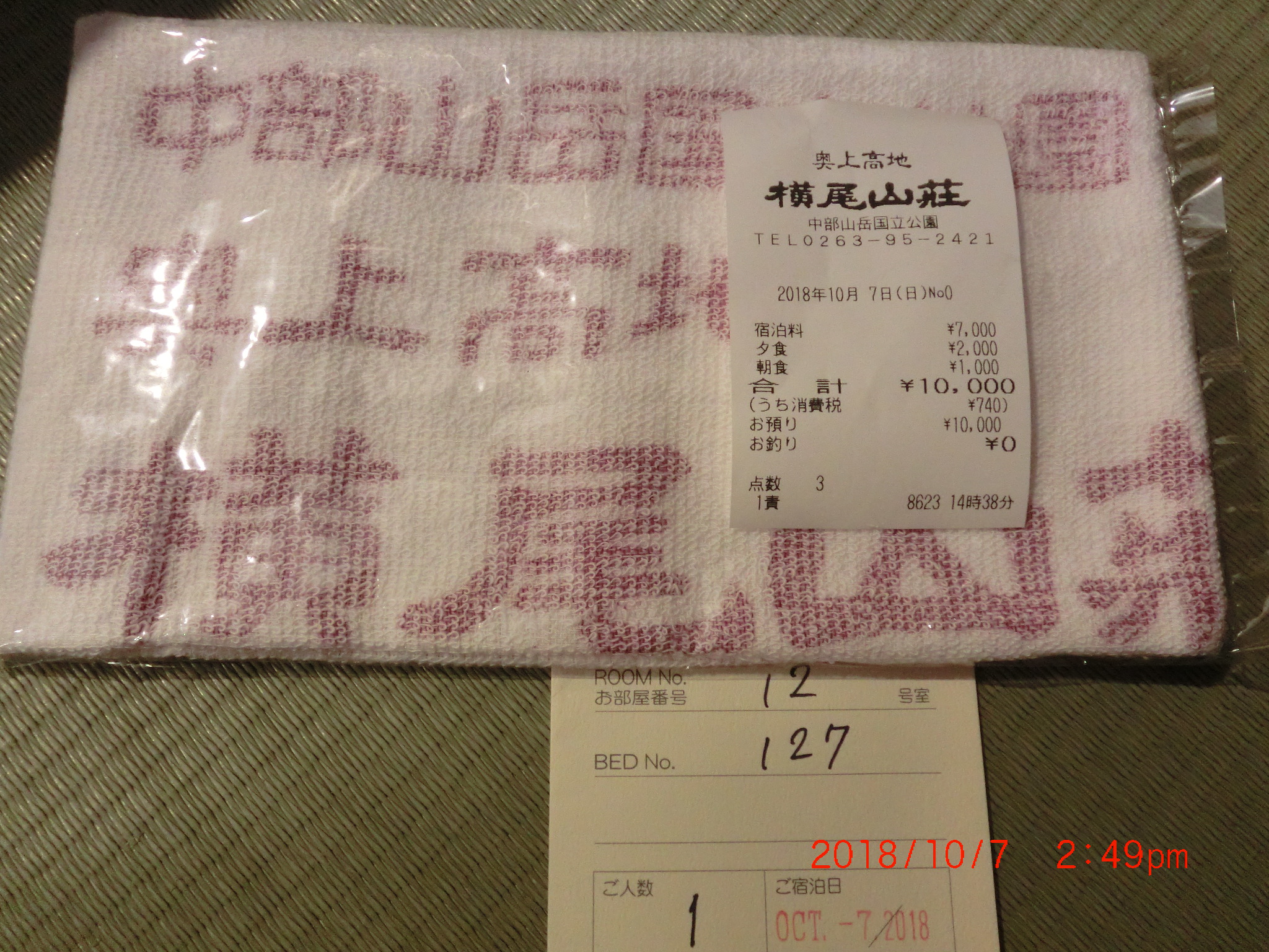 宿泊費は、夕食朝食付きで10000円。横尾山荘はお風呂がある。石けんの類いは使用不可だけど汗を流せて嬉しい。入浴は4時からなので、それまでザックの中の片付けをする。