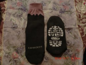 上手く写ってないけれど、こんなソックスを買ってみた。足裏は靴底柄に上高地と編み込んである。履口がピンクで穂高稜線だそうだ。登山用ソックスには薄手だけど小屋で履くにいいかなと買い求めた。850円也。