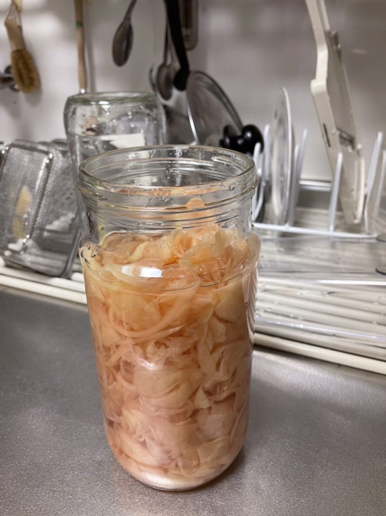 甘酢を入れた瓶の中に湯通しした生姜を入れると、見る見るうちに、真っ白ベッピン生姜がほんのりピンクに変化する。この過程が1番楽しい。