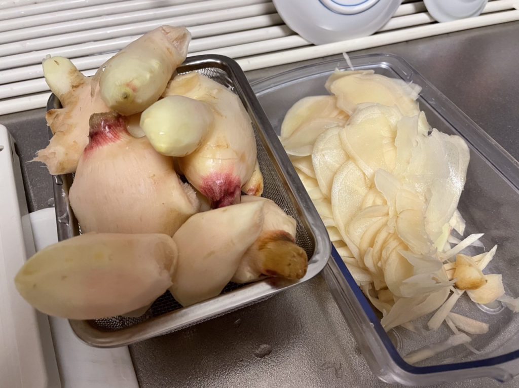 グローブみたいな生姜を小房に分けて、甘酢漬け用に薄くスライス。