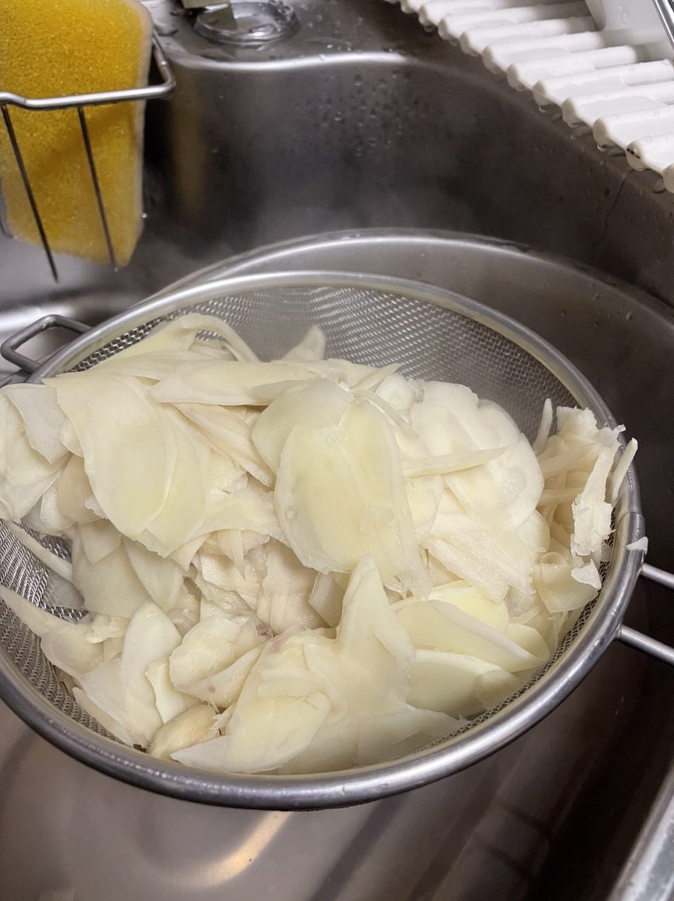 薄くスライスした新生姜をさっと塩茹で(湯通し)してアクを取る。