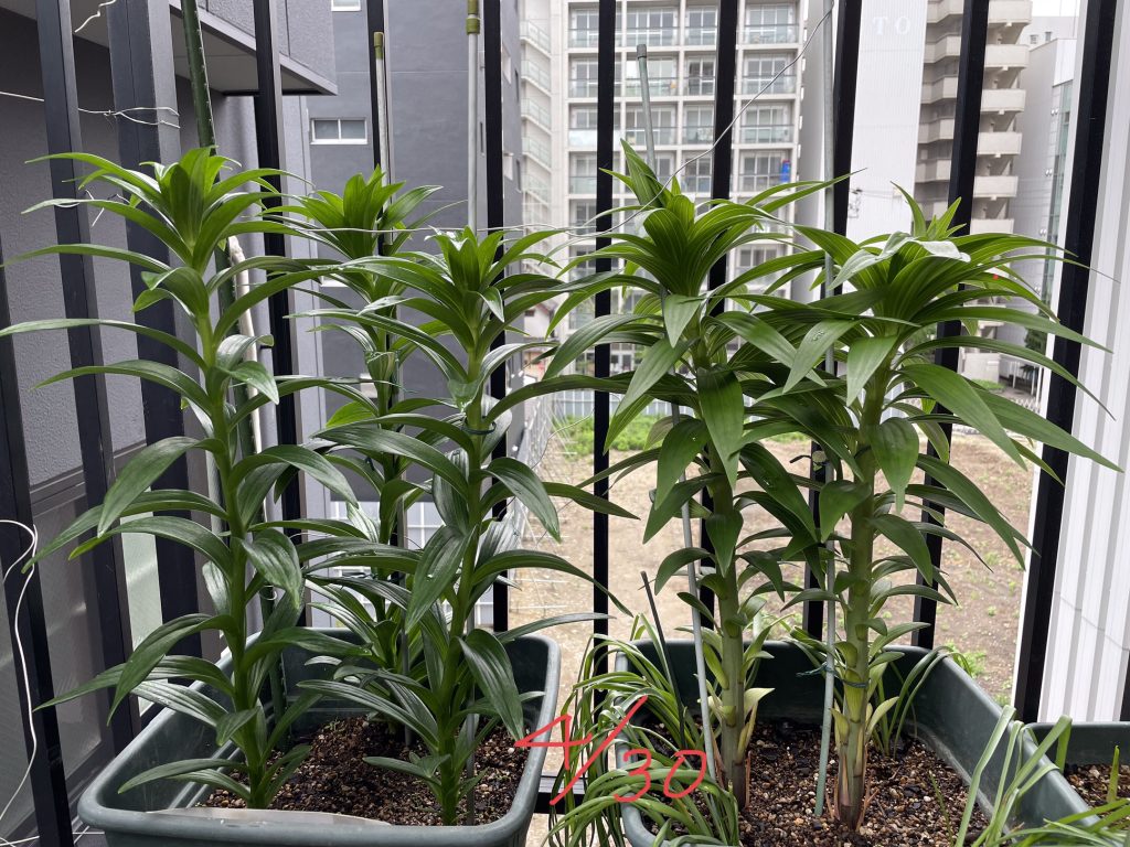 カサブランカの背丈がまだまだ伸びそう。風に吹かれて折れたら残念なので置く位置を変えてみた。